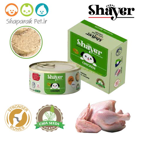 کنسرو پته توله سگ (shayer) در بین کنسروها حاوی پروتئین گوشتی بیشتری نسبت به غذای خشک هستند و با کربوهیدرات های کمتر ساخته شده اند این موضوع کمک بزرگی برای سگ های با اضافه وزن یا سگ ها با حساسیت های غذایی می باشد. ضمنا هیچ طعم و رنگ آمیزی مصنوعی در کنسرو های شایر استفاده نمی شود تا مواد گوشتی به حالت طبیعی خود نزدیک تر باشند. کنسروهای شایر ایرانی میباشد و از کیفیت بالایی برخوردار است وبا برندهای شسیر و استوزی در رقابت است. وزن کنسرو 120 گرم است.