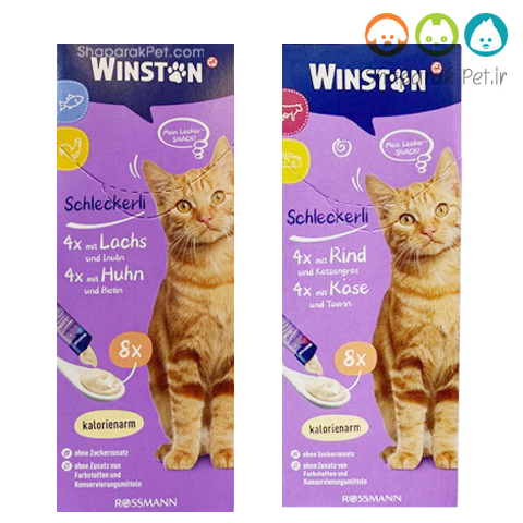 بستنی گربه وینستون در بسته بندی های جدید 8 عددی با دو طعم ( گوشت گاو ، پنیر و تورین ) و (مرغ ، ماهی قزل آلا و بیوتن ) می باشد. بستنی گربه نوعی تشویقی و یا میان وعده به حساب می آید که حالت کرم مانند و پوره ایی دارد و تمامی پشمالو ها از خوردن آن لذت می برند و مورد پسندشان است.  این بستنی سرشار از ویتامین E ، امگا 3 ، روغن ماهی ، تائورین (تقویت عضلات) و بیوتین (سلامت پوست و مو) می باشد . این محصول تولید کشور آلمان است.