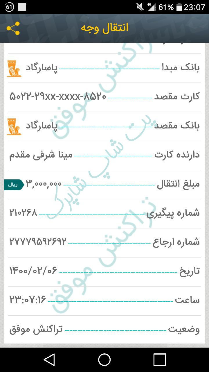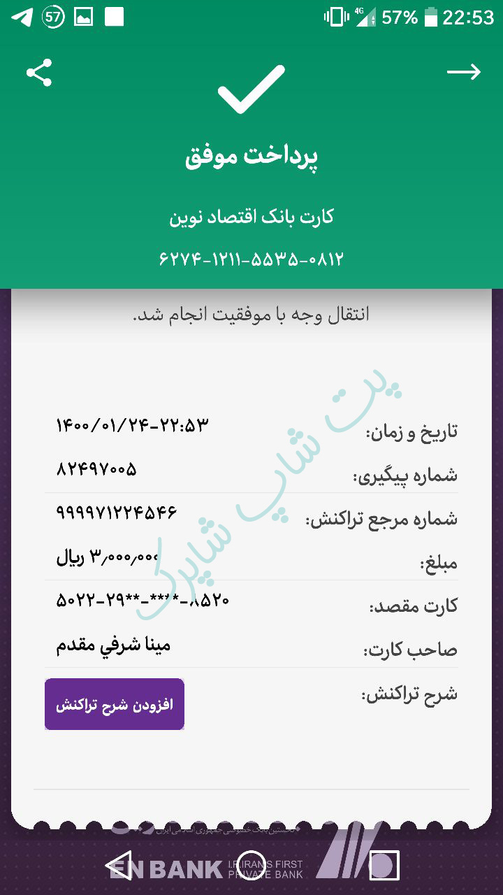 مبلغ 200 هزار تومان از کمک شما دوستان برای گربه تحت حمایت پیج کت اکباتان واریز شد.